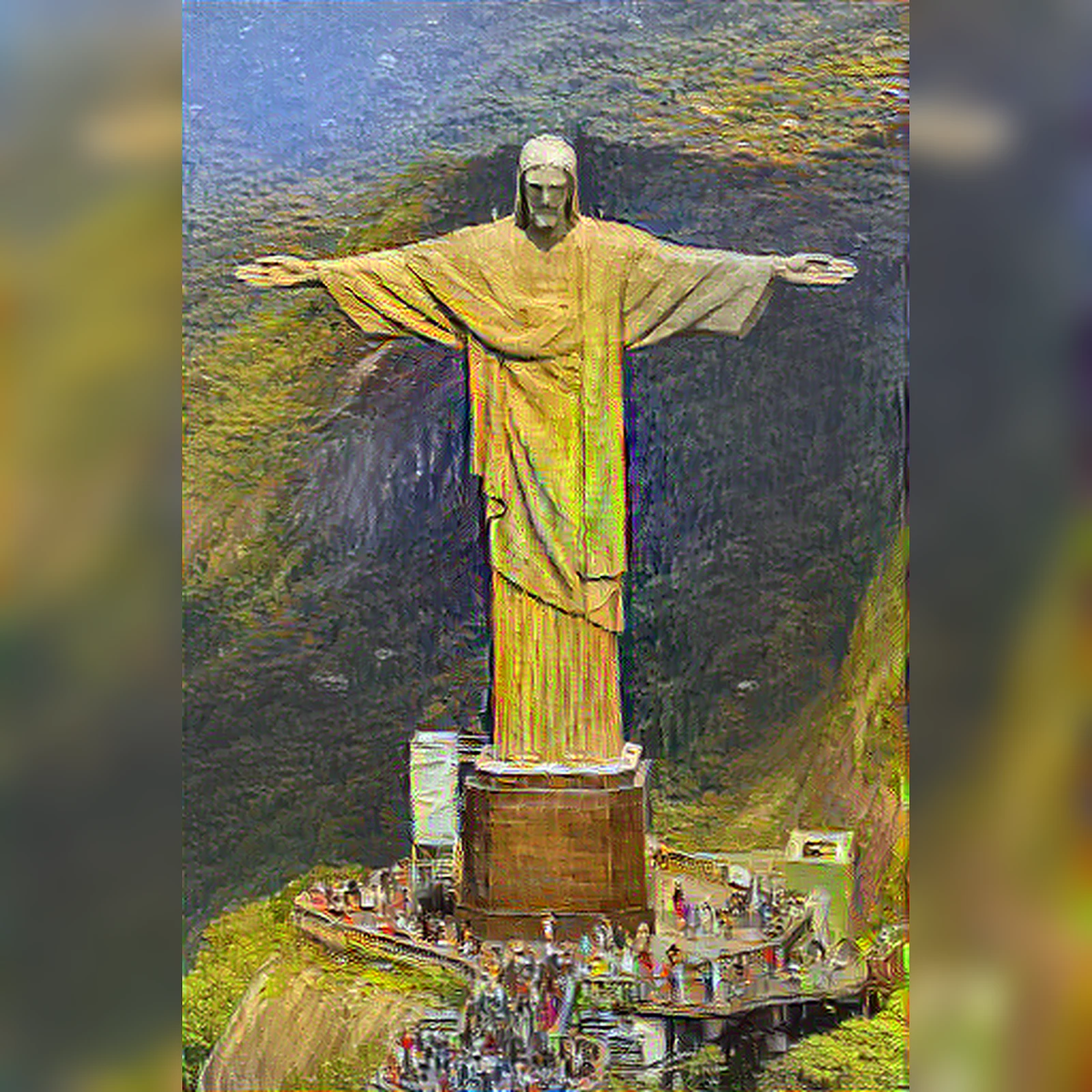 "Christ the Redeemer" reimagined in the style of Vincent van Gogh's Cafe Terrace at Night. Stunning art poster print perfect for wall art and home decor. High-quality original artwork inspired by masterpiece paintings.