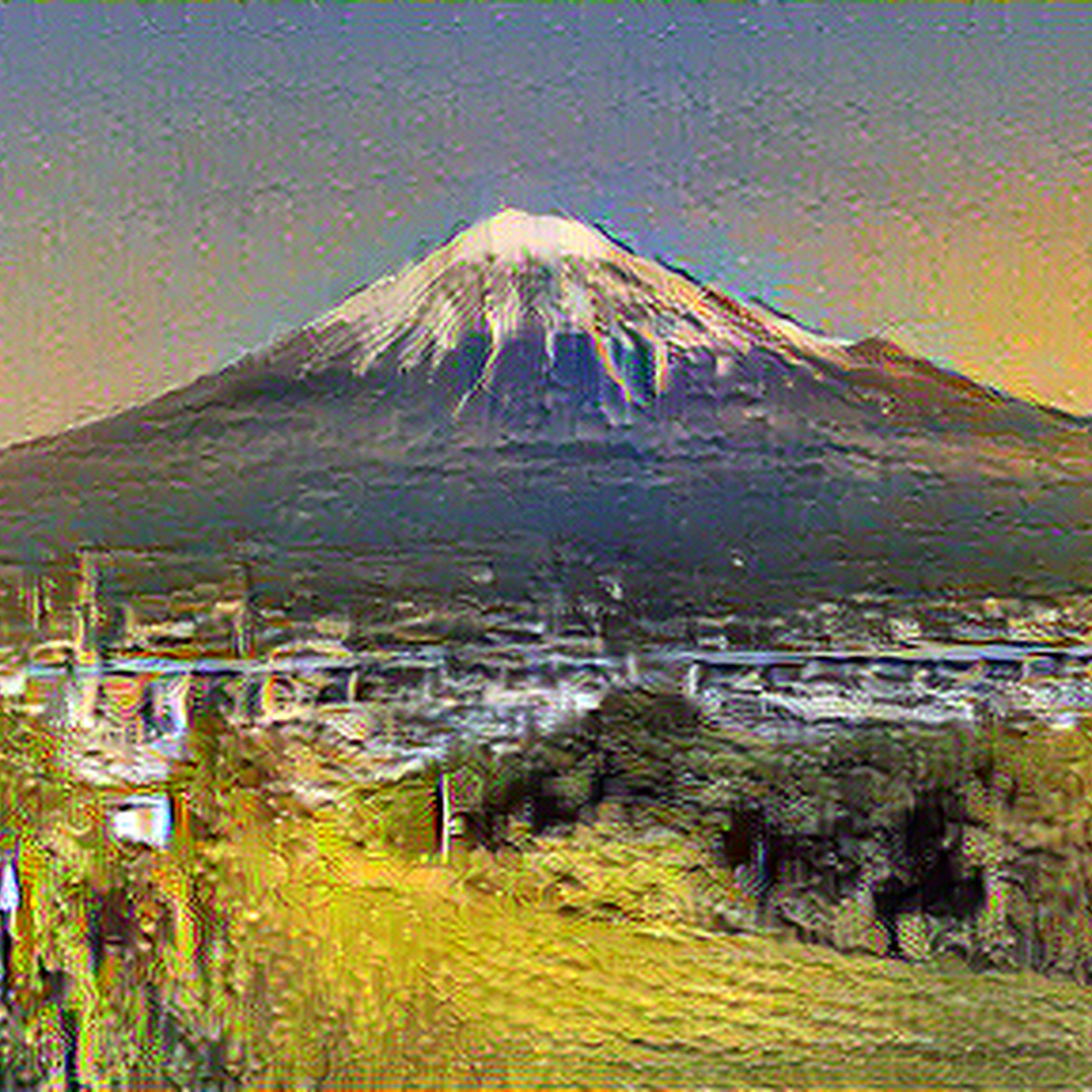 "Mount Fuji" transformed in the style of Cafe Terrace. AI-generated artistic print using neural style transfer. Available on t-shirts, stickers, posters, and more. High-quality original digital artwork.