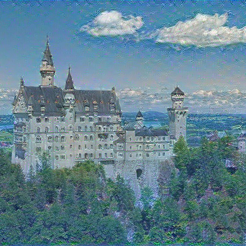"Neuschwanstein" transformed in the style of Water Lilies. AI-generated artistic print using neural style transfer. Available on t-shirts, stickers, posters, and more. High-quality original digital artwork.