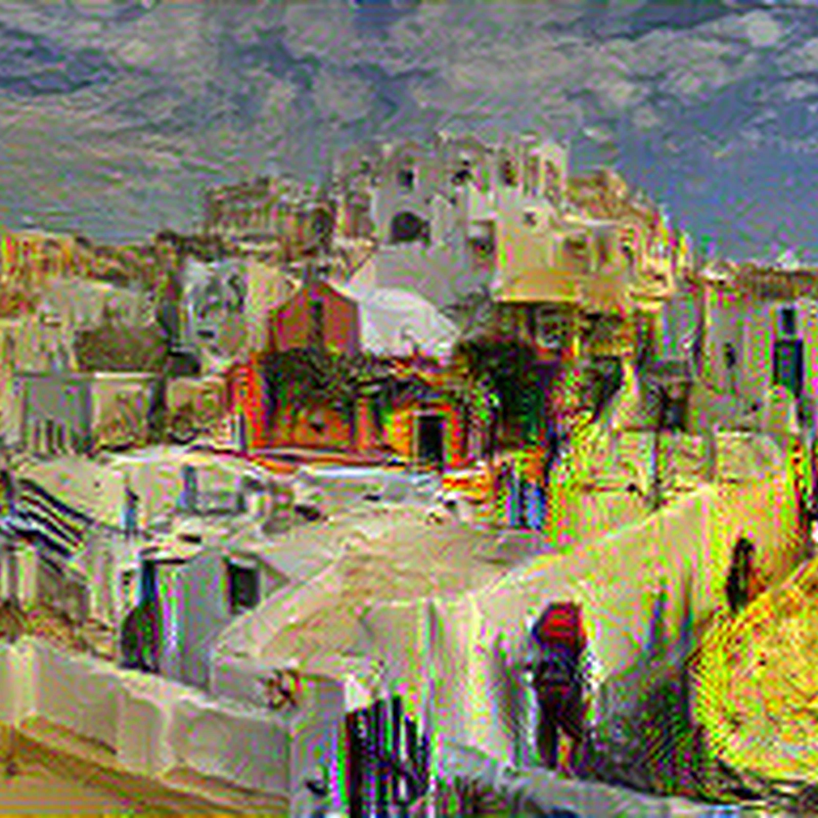 "Santorini" transformed in the style of Cafe Terrace. AI-generated artistic print using neural style transfer. Available on t-shirts, stickers, posters, and more. High-quality original digital artwork.