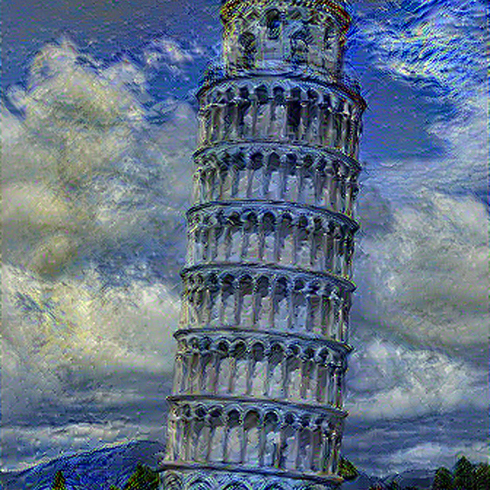 "Tower Of Pisa" transformed in the style of Starry Night. AI-generated artistic print using neural style transfer. Available on t-shirts, stickers, posters, and more. High-quality original digital artwork.